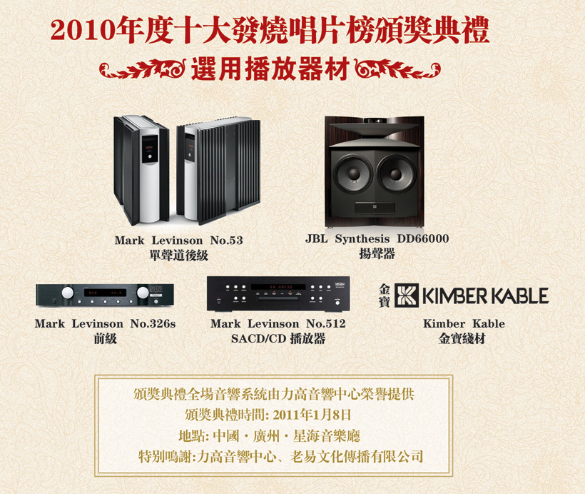 大奖结果于日前在广州星海音乐厅举行的“2010年度十大发烧唱片榜颁奖典礼”上公布。为了更好、更真实还原作品的风采,"颁奖音乐会"特别选用Hi-END级发烧器材现场演示:以JBL