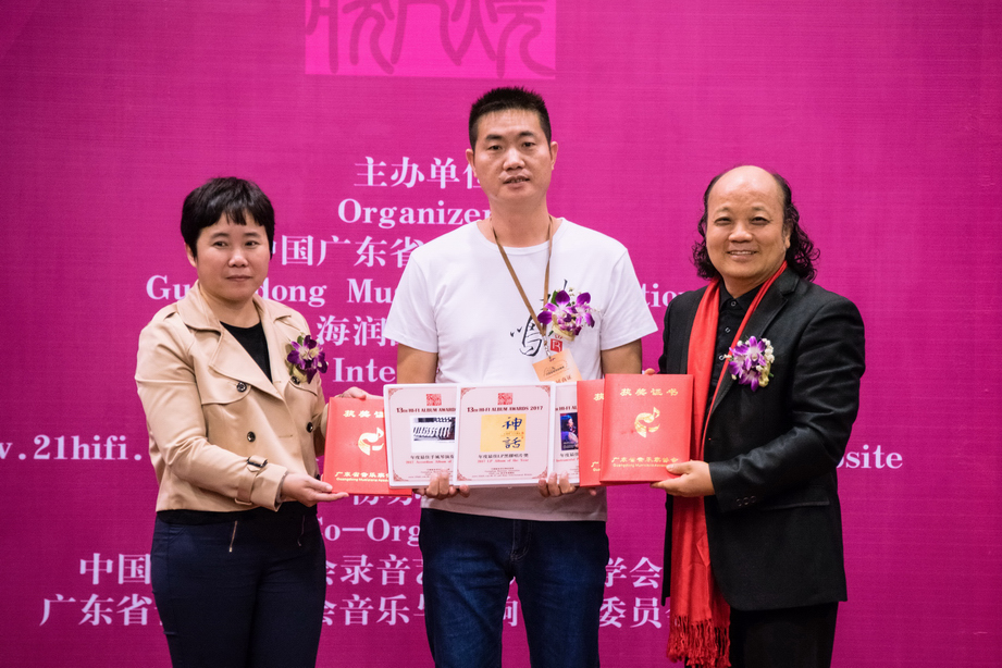 颁奖会现场:北京瑞鸣音乐有限公司销售总监刘军先生获颁奖项 (由广州爱乐集团总裁王勇先生、永通厂销售总监邱莉女士颁奖)