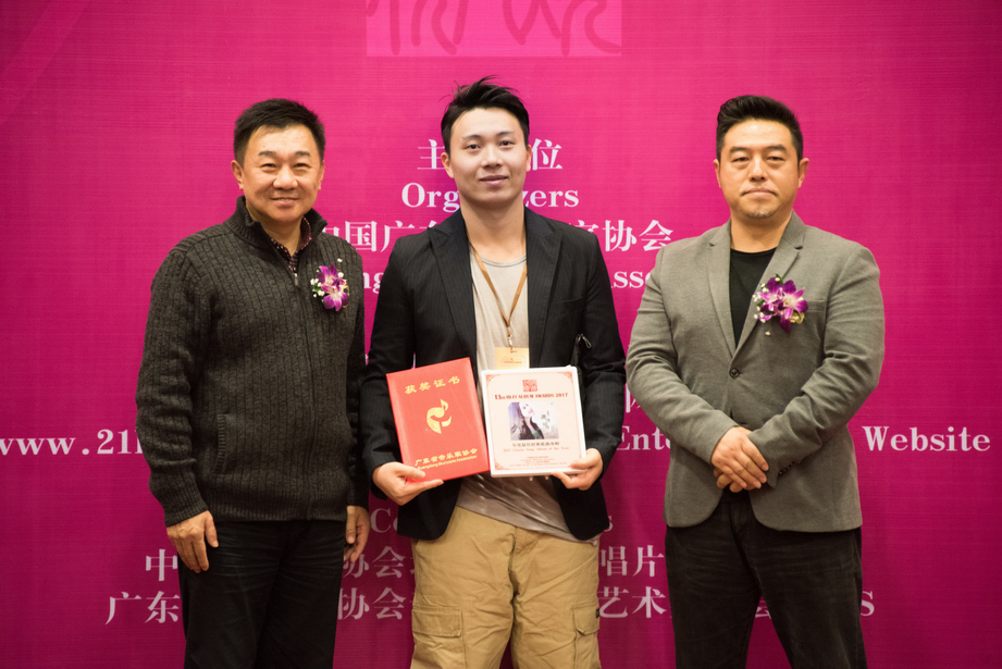 颁奖会现场:广州市雨林音乐制作有限公司录音师陈俊和先生获颁奖项 (由广东省音乐家协会副秘书长乔建军先生、海润国际传媒广东公司副总经理张旭东先生颁奖)